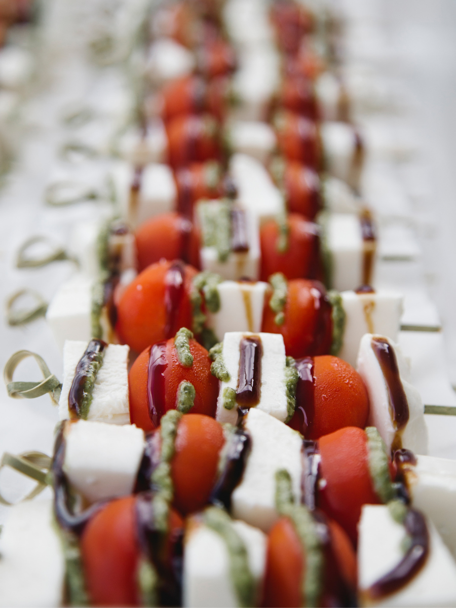 - Tomato basil Mozzarella Caprese with a balsamic reduction and a stuffed green olive